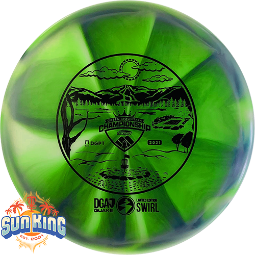 This gorgeous run of Limited Edition Swirl Quakes were produced as fundraisers for the 2021 DGPT Green Mountain Championships. Each disc was made using a special blend of swirly plastic which created lots of colorful and unique-looking variations! Stamps on each disc feature the tournament artwork with added DGA elements. Be sure to add one of these to your bag now before they are gone!
