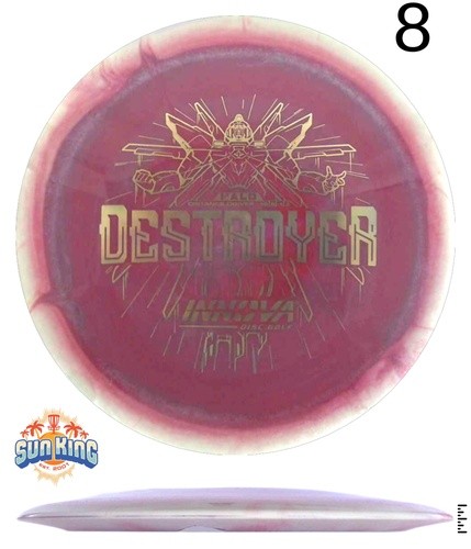 The Destroyer is a very fast overstable long distance driver. This disc is much like a faster Wraith, but with a little more high and low speed stability. Great disc for sidearm throwers and those with lots of power. Can handle headwinds and throws with off axis torque. Not suggested for beginning players.