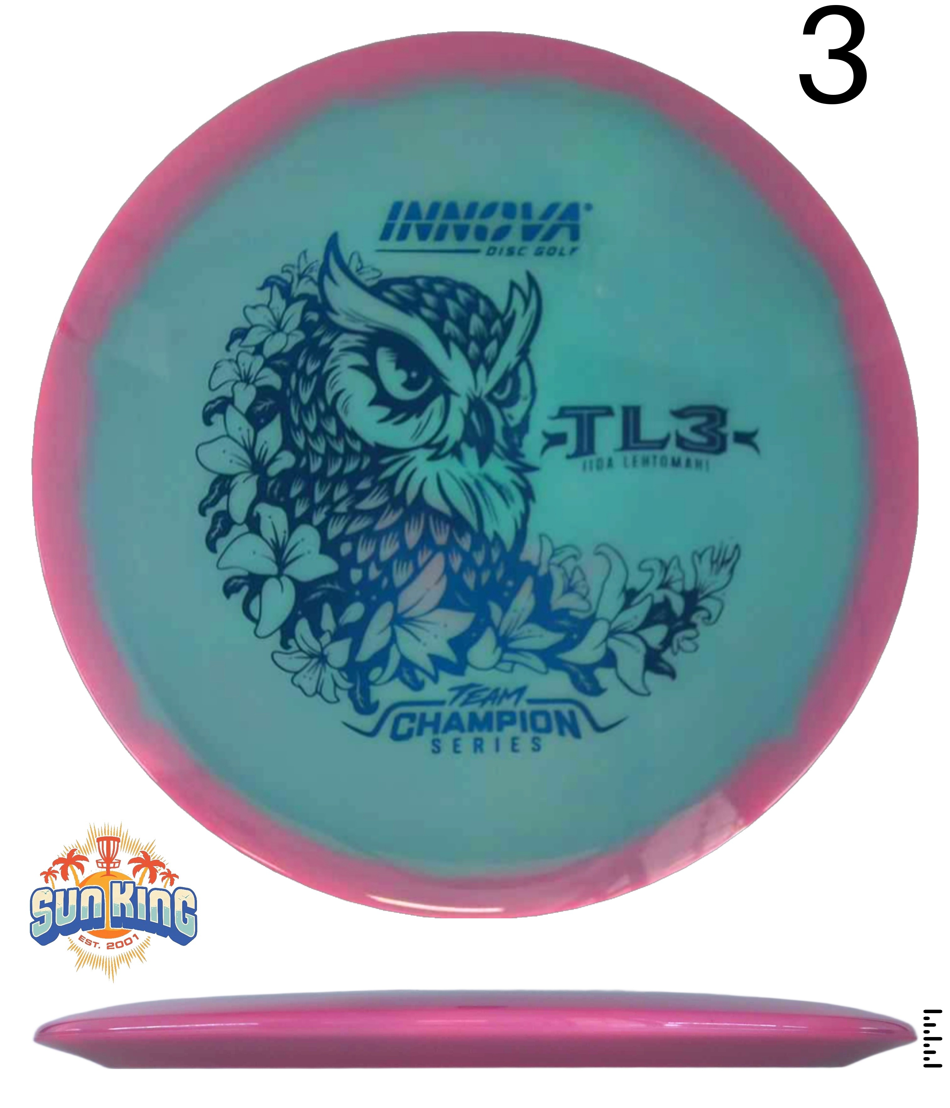 TL3 represents the evolution of the traditional and straight flying TeeBird-L, also known as TL. Like in other Innova 3-models, familiar and highly liked mold has received a new flight plate, which gives the 3-models a lower profile. Lower profile makes the disc more faster, and that’s why TL3 has a speed rating 8 instead of traditional TL’s 7. TL3 has a straight and trusty flight like TL, and it holds the release angle great. This is possibly the best, controllable, straight flying fairway driver with a minimal fade, that there is.
